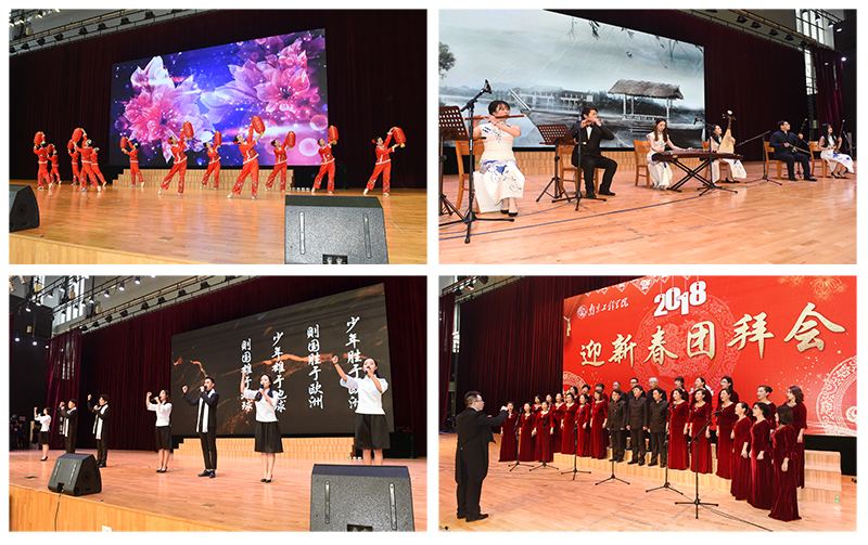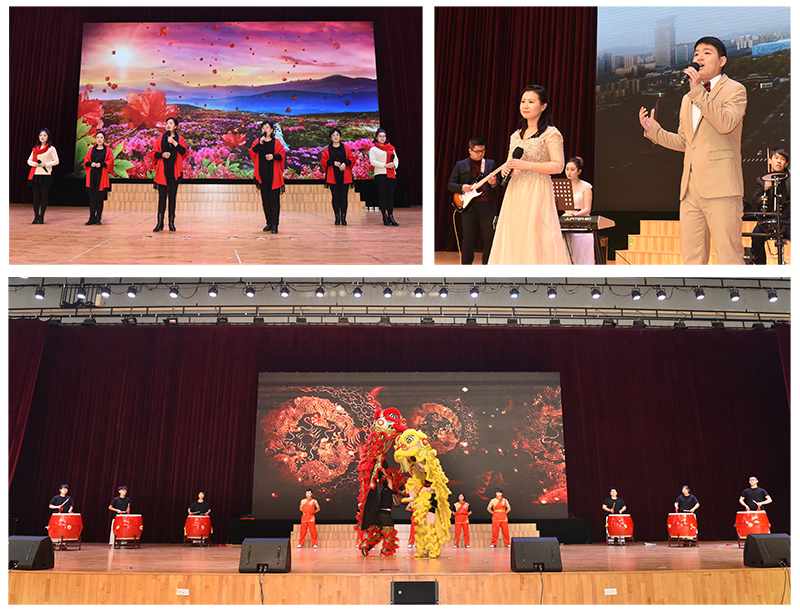 团拜会现场座无虚席,热闹非凡。由校领导带来的合唱《我们走在大路上》拉开了活动序幕,他们用歌声表达了团结一心、带领全校师生员工向着高水平应用型工程大学之路迈进的信心和决心,催人奋进,鼓舞人心。紧接着,各分工会选送、师生员工自编自演的节目精彩上演,乐器演奏、歌伴舞、独唱、合唱、诗歌朗诵应有尽有。舞蹈《好运来》、朗诵《少年中国说》、独唱《不忘初心》、器乐对唱《我爱你中国》、舞狮《狮动》、京剧《智斗》、歌曲联唱《映山红等》、马头琴《万马奔腾》、歌伴舞《鸿雁》、民乐《青花瓷》、合唱《我和我的祖国》、《校歌》等节目精彩纷呈,充分展现了raybat官网师生员工蓬勃向上的精神风貌,赢得现场观众阵阵掌声。台上台下欢歌笑语,其乐融融,呈现出一派温馨和睦、欢乐祥和的氛围。