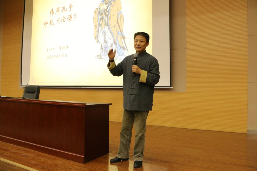 董振博老师语言幽默,风格独特。讲座伊始,董老师通过王导家族励志勤学的家训,开启讲座之门。“圣人之道,闻者多纳。”董老师又以法国大思想家伏尔泰对孔子崇拜的实例,侧面表现孔子之贤与《论语》之妙。在讲座中,董老师用孔子生活中一个个生动的故事还原了真实的孔子形象,让在场师生了解到孔子作为普通人的一面。董老师还总结了他近年关于研究孔子的五一工程:一时、一地、一圣、一树、一果。言简意赅,体现了他对孔子与《论语》的深刻理解。讲座即将结束之时,董振博老师以丁龙之例呼吁同学们担当时代大任,传承孔子与《论语》的精神。"家无国不安,国无家不稳",短短十个字,铿锵有力、意味深长,现场不约而同地响起热烈掌声。