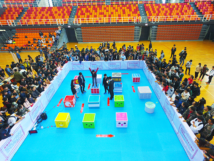 说起这个将小游戏元素融入主题实践活动的创意,主创人员徐淳钰同学特别兴奋,“年初‘跳一跳’刚流行的时候,我看过团中央的一条微信,从‘跳一跳’中延伸到对人生哲理的解读,觉得特别有趣。开学以后就开始琢磨能不能把这个流行元素和主题学习活动结合起来。”“春暖花开,正是运动和学习的好时机。我们不如把‘跳一跳’搬到体育馆来吧,配上有奖答题,游戏、运动、学习三不误。”徐淳钰的创意很快得到了分团委老师的支持。在老师的帮助下,徐淳钰、施皓、傅亚启几个同学忙乎开了,写策划、找道具、设计问题……。为了寓教于乐,引导同学们感悟十九大、思考新时代新青年的责任与担当,大家在设计问题时动足了脑筋。据介绍,活动共设计了四轮题目,分别是诗词浅赏、党团小知识、成语竞猜和“厉害了我的国”即兴演说。“玩过手机‘跳一跳’的都知道,游戏小人在一些特殊的小盒子上停一停是可以加分的,在我们现场版的小盒子上停一停、答对了问题同样也可以加分,寓意着新时代的大学生,不能两耳不闻窗外事,还要坚定信念、培养品格、开阔视野,这些都是青春的加分项。”电力工程学院分团委书记的解释,说出了活动策划者的良苦用心。