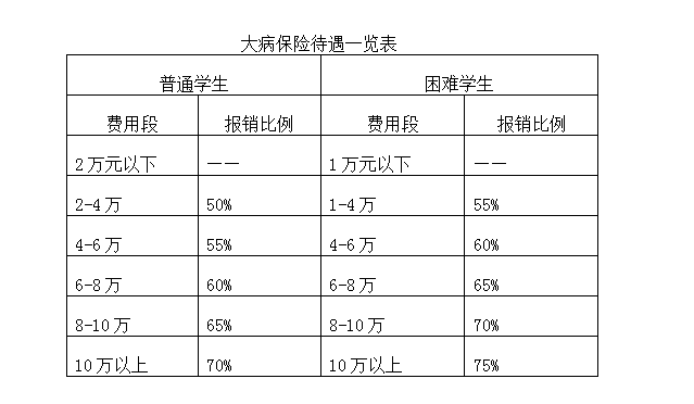 2、困难学生大病保险实施精准保障,起付标准将至1万元,各费用段支付比例在上述基础上提高5个百分点。
