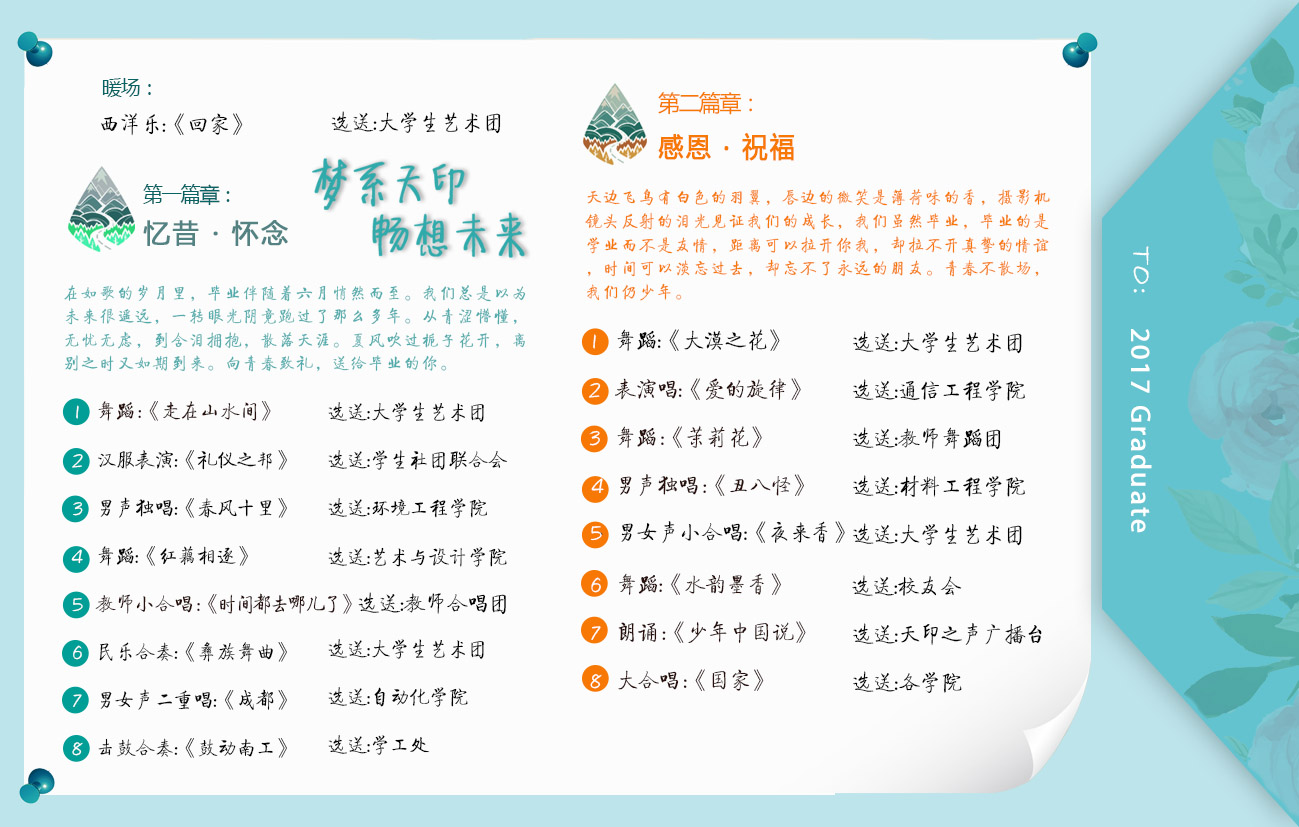 时光匆匆,雷竞技raybat竞猜即将送走2017届全体毕业生,他们将满怀激情、斗志昂扬离别雷竞技raybat竞猜这个团结友爱的大家庭,展翅高飞。通过举办欢送2017届毕业生文艺晚会,师生共聚一堂,以表达对毕业生的美好祝福和殷切期望,并借此让毕业生再次感受学校大家庭温暖而又美好的回忆,共同勾画精彩的毕业诗章,给大学生涯画上一个圆满的句号!