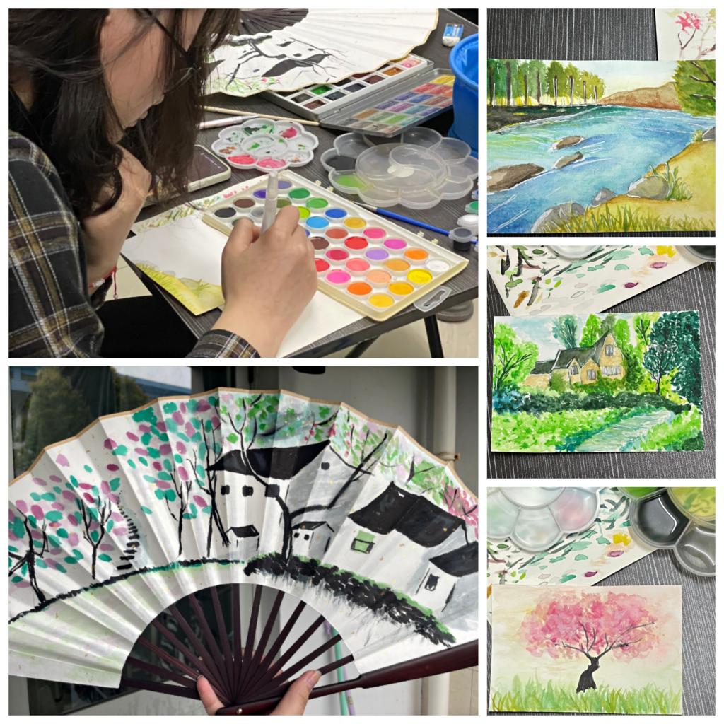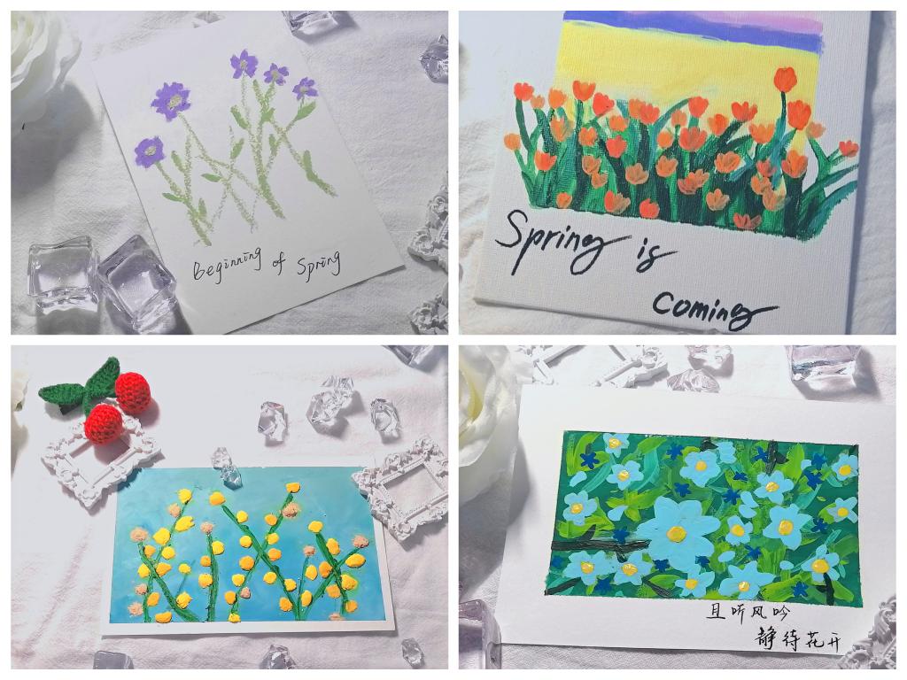 自古以来,扇子不仅有实用功效,也有友人相赠、以表情谊的作用。活动中,同学们以空白折扇和明信片为载体,抒发对于春天的美好向往和憧憬。百花景里绘百花,对于才华横溢的北一B303宿舍的同学们来说自然是信手拈来。色彩斑斓、五彩缤纷的画作,已然使人身临其境,畅游烂漫花海。东五B316宿舍的同学们也大展身手,在折扇上描绘出生机盎然的江南景色。每一笔轻柔的笔触,都让人不禁感慨同学们心中的美好世界。