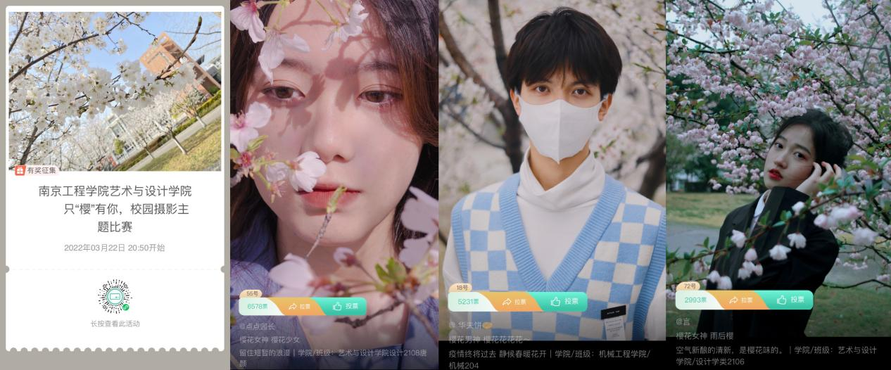“樱花红陌上,杨柳绿池边”,三月校园里的樱花已经悄然开放,艺术与设计学院面向全校开展“只‘樱’有你”校园主题摄影比赛,用相机定格春天里的每一个美好瞬间。本次比赛分为“樱花男神”和“樱花女神”两个板块,采用网络评选方式,共180人投稿,总计六万次点击率,其中机械204班陈一航、设计2109班李馨怡分别获得男女生榜单第一名。