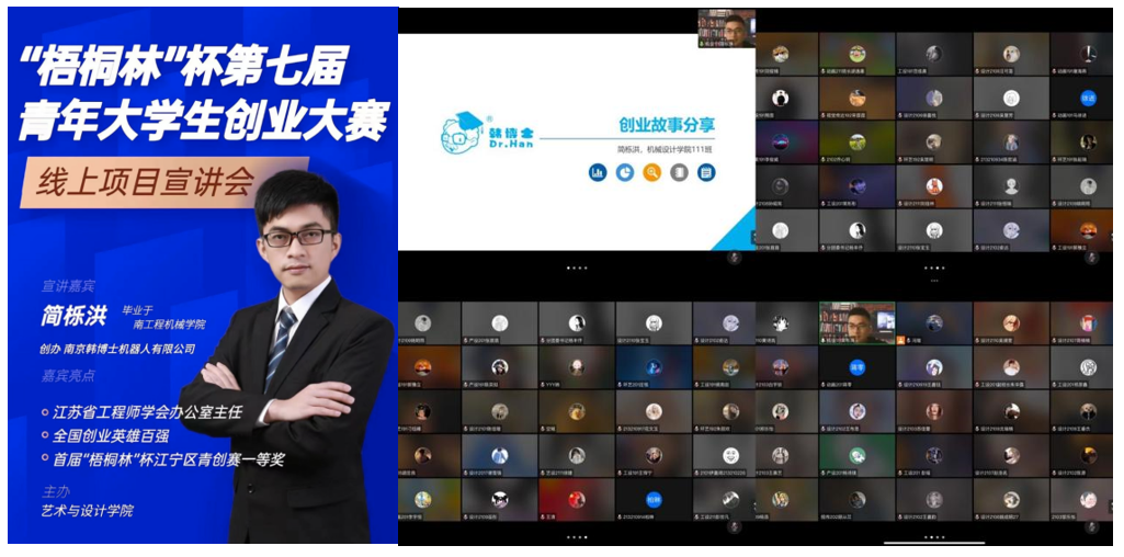 毕业于机械工程学院的简栎洪创办了南京韩博士机器人有限公司,他是全国创业英雄百强,省先进科技工作者,曾获首届“梧桐林”杯江宁区青创赛一等奖、“创青春”全国大学生创业大赛江苏银奖、中国“互联网+”创新创业大赛江苏省二等奖等多次创业大赛大奖。他创办的企业三次登入中央电视台并在CCTV-2《创业英雄汇》栏目获得融资。“创业要打开格局,要虚实结合,要把握细节……”简学长结合自身创业实践,对如何规划大学生活、如何开启创业梦想、如何在创业比赛中脱颖而出,通过屏幕与同学们分享心得。
