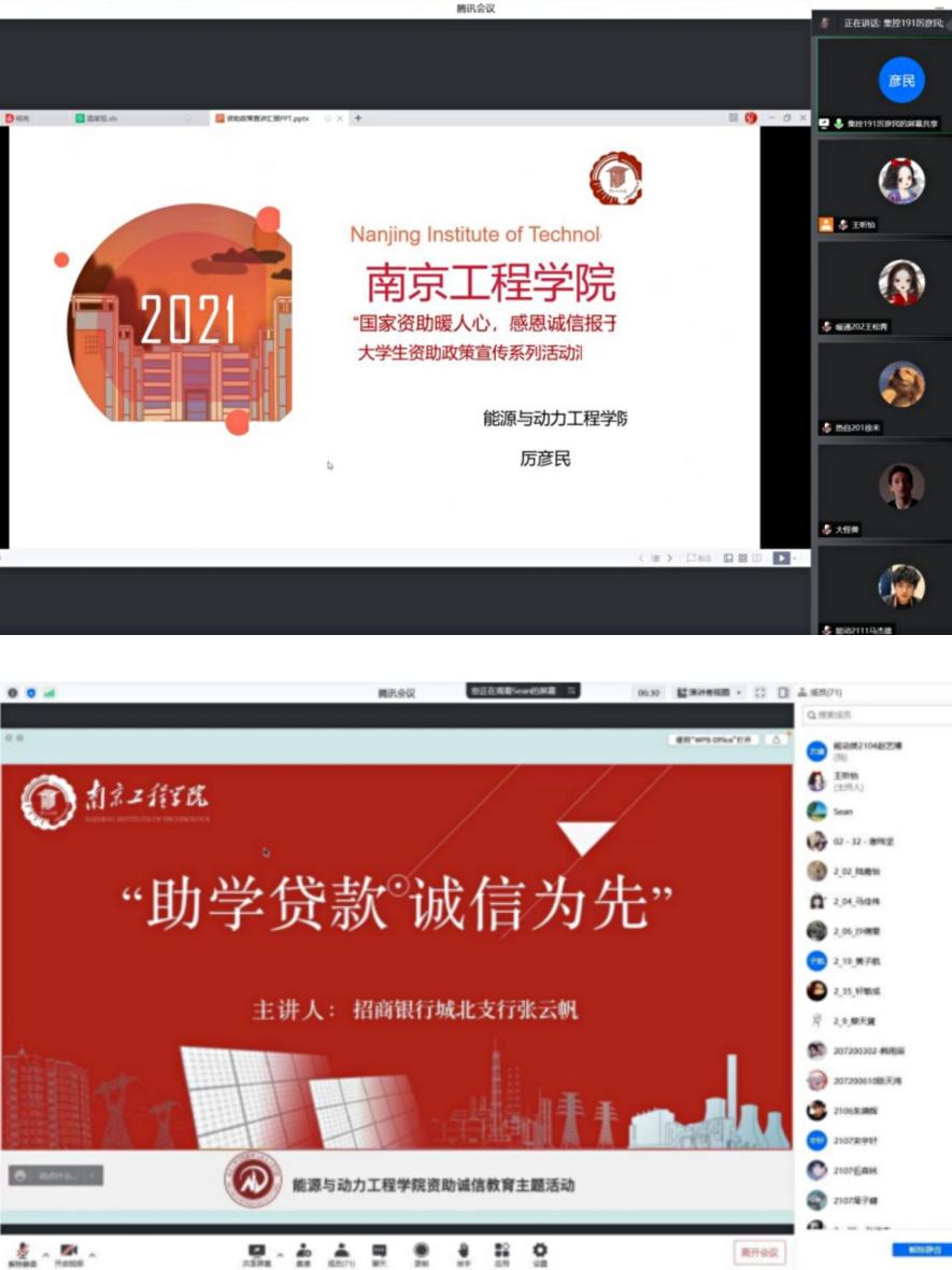 “国家助学政策不仅仅给于我们物质的援助,更重要的是精神上的激励与鞭策,它将成为一种巨大的精神动力,鼓舞我们向着更高的目标不懈努力。”集控191班厉彦民在资助政策宣传讲座中说道。作为2021年江苏学生宣传资助大使,他从自身受助成才经历出发,向困难学生介绍国家及学校资助政策,强化同学们对“诚信、感恩、自强”的认识和理解,引导同学们心怀感恩,砥砺奋进,勇于追梦,自强成才。学院还邀请到招商银行南京分行城北支行贵宾经理张云帆为大一新生带来助学贷款政策解读与金融征信知识宣讲,帮助同学们更好地了解助学贷款的办理流程与注意事项,掌握金融征信知识,提高反诈意识。