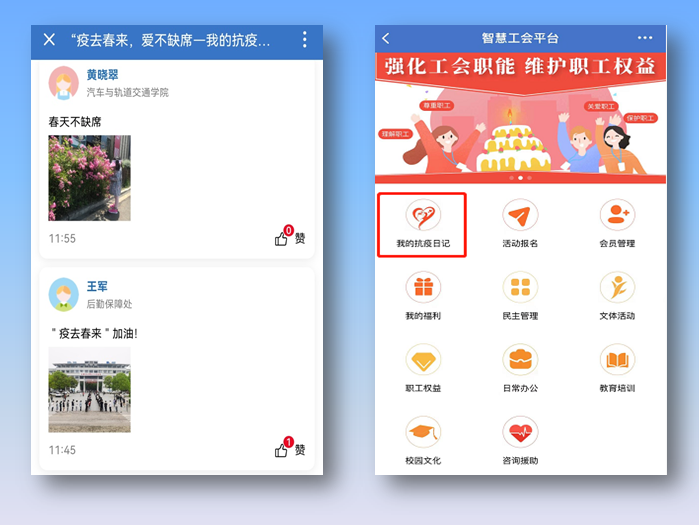 此次打卡活动以“疫去春来 爱不缺席”为主题,倡导教职工在一个月内完成21天打卡。从心理学角度来看,“21天效应”是指从形成一个人新习惯和新理念至少需要的天数。活动期内,教职工每天通过文字或者图片的形式,描述所见所闻、所思所感。或是居家办公间隙发现的美景如画,或是住校轮值体悟到的责任担当,或是线上教学师生互动的平凡快乐,传递着日常学习、生活、工作中的幸福与温暖。经统计,共有近600名教职工通过“智慧工会”平台参加本次活动,累计打卡1.6万余次。