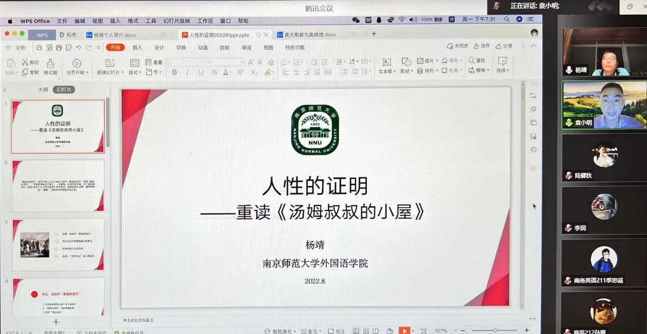 8月1日,外国语学院邀请南京师范大学外国语学院教授、博士生导师、美国文明研究所所长杨靖作了题为“人性的证明—重读《汤姆叔叔的小屋》”线上讲座,讲座由该院副院长(主持工作)袁小明主持,学院师生聆听学习。