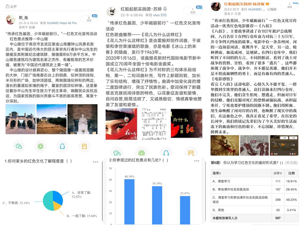 没有调查就没有发言权。为及时全面探究大学生对红色文化的认知程度和认同感,7月15日-8月5日,实践团在线上发起了问卷调研,向多地大学生发放有效调查问卷585份,内容涉及对家乡红色文化的了解程度、参观次数、获取途径、学习形式等多个方面。调研中,实践团成员发现,因学业压力、时间精力等原因,仅有32.82%的大学生表示对家乡红色文化非常了解,40.34%的大学生参观红色景点的次数少于5次,但大部分学生认为学习红色文化意义非凡,对于宣传红色文化的积极性较高,有60%的人愿意向周围的同学、朋友宣传红色文化知识,有49.23%同学认为学习红色文化的最好形式为课堂学习和社会实践相结合,因此实践团成员在调研讨论中认为“各大红色实践基地应积极利用寒暑假,招募大学生志愿者,学习了解家乡红色文化的同时,开展红色宣讲,为家乡贡献青年力量”。与此同时,实践团各成员搜寻红色资料,充分发挥微博等网络新媒体的作用,发起了“传承红色基因,少年砥砺前行”的红色宣传活动,包括红色好书推荐、红色电影观感、红色歌曲传唱等,尤其是在徐州、常熟、泰州和盐城等地的红色景点变身“线上讲解员”,自制“红色之旅”游览感悟短视频,呼吁当代大学生关注红色文化,共同探究红色历史。据悉,实践团成员后续将有效整理和分析此次问卷调查和线上宣传活动参与数据,形成调研报告,并通过进纪念馆、社区、学校拓展青年红色文化认同宣讲。