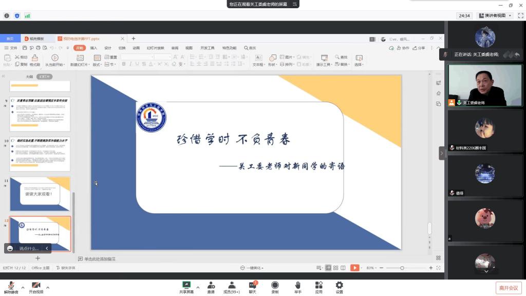 学院关工委老教师虞力人以“心怀爱国之情,笃行报国之志”为主题,与新生讲述了中国共产党成立以来在各个领域范围内取得的显著成就,以及中国人民在家庭、生活上发生的崭新变化。他说,作为新时代大学生,要有坚定的理想信念,要学习大国工匠精神,将“小我”融入“大我”,勇敢地接过历史的接力棒,肩负新时代使命,在实现中华民族伟大复兴的新征程中不懈努力、持之以恒,为人民幸福、民族振兴、国家富强的理想目标而接续奋斗!“我们作为新时代青年,站在百年未有之大变局的十字路口,更应练就过硬本领,投身强国伟业,让青春在党和人民最需要的地方绽开绚丽之花!”虞老师的讲述加深了同学们对中共党史的理解,筑牢了新生的理想信念根基。