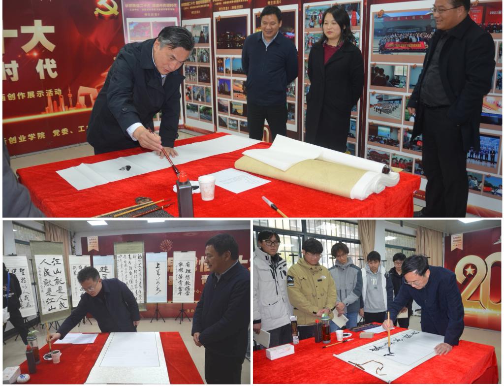 学党的二十大精神,翰墨书写新志向。周明虎、叶长青、何国友等老师挥毫泼墨,党的二十大报告中的诸多关键词、重要句跃然纸上,或端庄大气如“有理想 敢担当 能吃苦 肯奋斗”,或雄浑有力如“踔厉奋发”,精彩的书法作品与党的二十大精神相融,使党的二十大精神学习教育获得了新的形式与载体。现场部分学生受到感染,也执笔磨墨,书写心中志向。几位书法专业人士还逐一为观众讲解了每一幅字的特点和风格,讲授书法专业知识,活动现场趣味横生。“我们的老师真厉害,不仅能教书,字还写得这么棒!报告里关键词句一下就印在心里了。”同学们如是说。