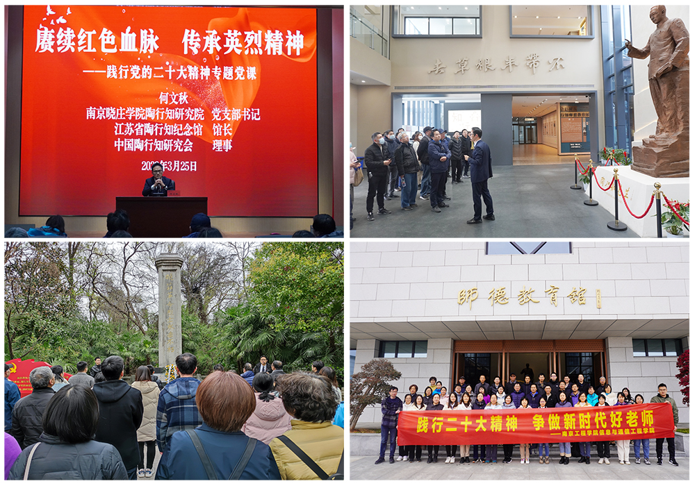 3月25日,学院教师在党委书记章启成带领下来到南京北郊劳山脚下的行知园,满怀着崇敬参观陶行知纪念馆。陶行知纪念馆馆长何文秋在报告厅做《赓续红色血脉 传承英烈精神——践行党的二十大精神专题党课》讲座,生动详实地讲述了陶行知先生为中国教育事业奋斗一生的光辉事迹,倡议老师们学习陶行知“爱满天下”的精神,关心、关爱每位学生,不忘初心、牢记使命,努力做一名“有理想信念、有道德情操、有扎实学识、有仁爱之心”的“四有”老师。在师德教育馆,何馆长带领大家逐一观看展厅并作讲解。一支钢笔、一件学士服、一本书籍……他饱含深情地讲述每一件文物背后的鲜活故事,真实而生动地展现了陶行知先生“捧着一颗心来,不带半根草去”、为教育而奔波的一生。身临其境的现场教学,让在场的教师们进一步深刻领悟陶行知“表里如一”“知行合一”的教育理念和伟大精神。参观结束后,教师们怀着崇敬的心情瞻仰了晓庄革命烈士纪念碑,拜谒了陶行知先生墓,一一献上花篮,鞠躬并默哀。活动最后,信息与通信工程学院党委和陶行知纪念馆签订基层党组织共建协议书。